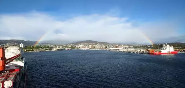 ????當(dāng)?shù)貢r(shí)間11月7日上午,搭載107名中國第36次南極考察隊(duì)員的“雪龍”號??堪拇罄麃喕舭吞馗劭?,與先行靠港的“雪龍2”號正式匯合。