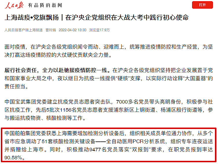 “中國(guó)船舶集團(tuán)黨組獲悉上海需要增加檢測(cè)分析設(shè)備后,組織相關(guān)成員單位通力協(xié)作,從多個(gè)省市應(yīng)急調(diào)動(dòng)了51套核酸檢測(cè)關(guān)鍵設(shè)備——全自動(dòng)醫(yī)用PCR分析系統(tǒng),組織專車連夜運(yùn)送并捐贈(zèng)給上海市。同時(shí),積極推動(dòng)9477名黨員落實(shí)‘雙報(bào)到’要求,在職黨員報(bào)到率達(dá)90.58%?!?/p>
