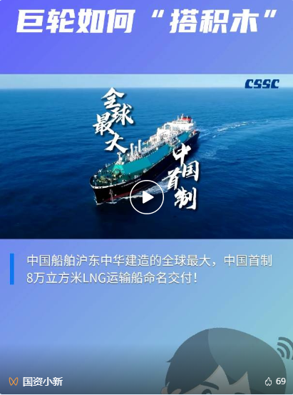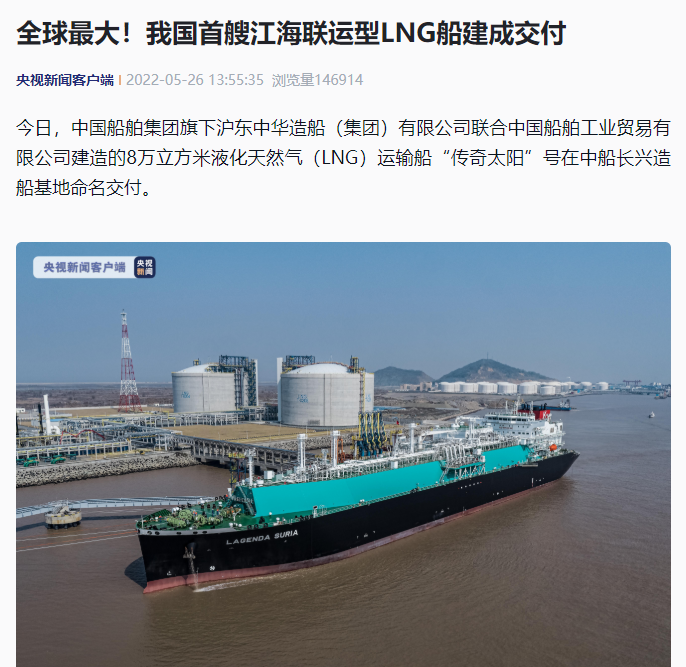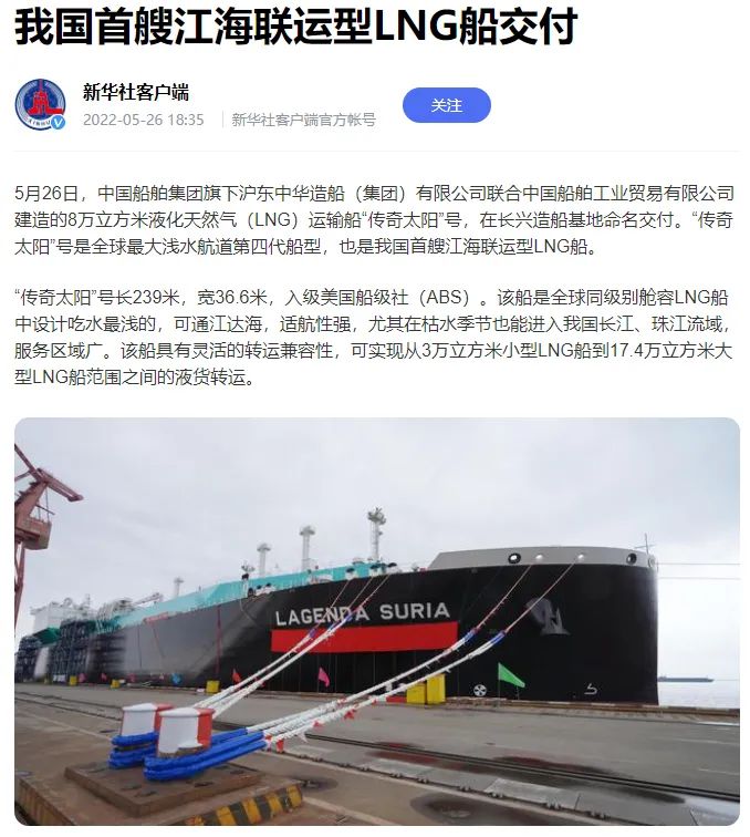 5月26日,中國船舶集團(tuán)旗下滬東中華聯(lián)合中船貿(mào)易建造的8萬立方米液化天然氣(LNG)運(yùn)輸船“傳奇太陽”號在長興造船基地命名交付?!皞髌嫣枴碧柺侨蜃畲鬁\水航道第四代、我國首款首制首艘江海聯(lián)運(yùn)型LNG船,填補(bǔ)了中國淺水航道LNG船的空白,在該細(xì)分市場占有率最高,有望成為中國船舶制造的又一精品船型。