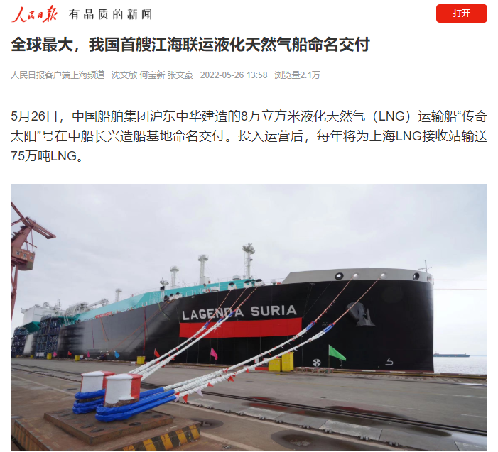 “傳奇太陽”號是滬東中華自4月25日復(fù)工復(fù)產(chǎn)以來交付的第二艘船,投入運(yùn)營后,每年將為上海LNG接收站輸送75萬噸LNG。另悉,2號船計(jì)劃于下個月交付,屆時“姊妹船”聯(lián)袂為上海社會經(jīng)濟(jì)發(fā)展、清潔能源保供和綠色產(chǎn)業(yè)振興將發(fā)揮重要作用。