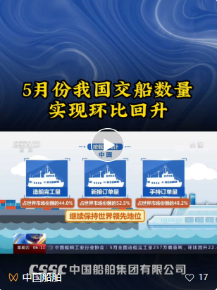 據統(tǒng)計,截至五月底,中國船舶集團交付新船82艘、598萬載重噸,分別完成年度計劃的42%和43%,為完成全年目標任務奠定了良好基礎。