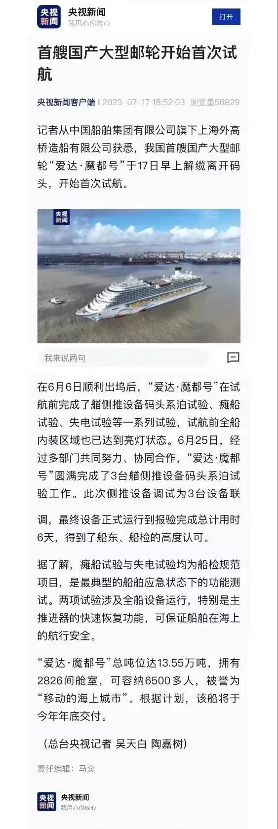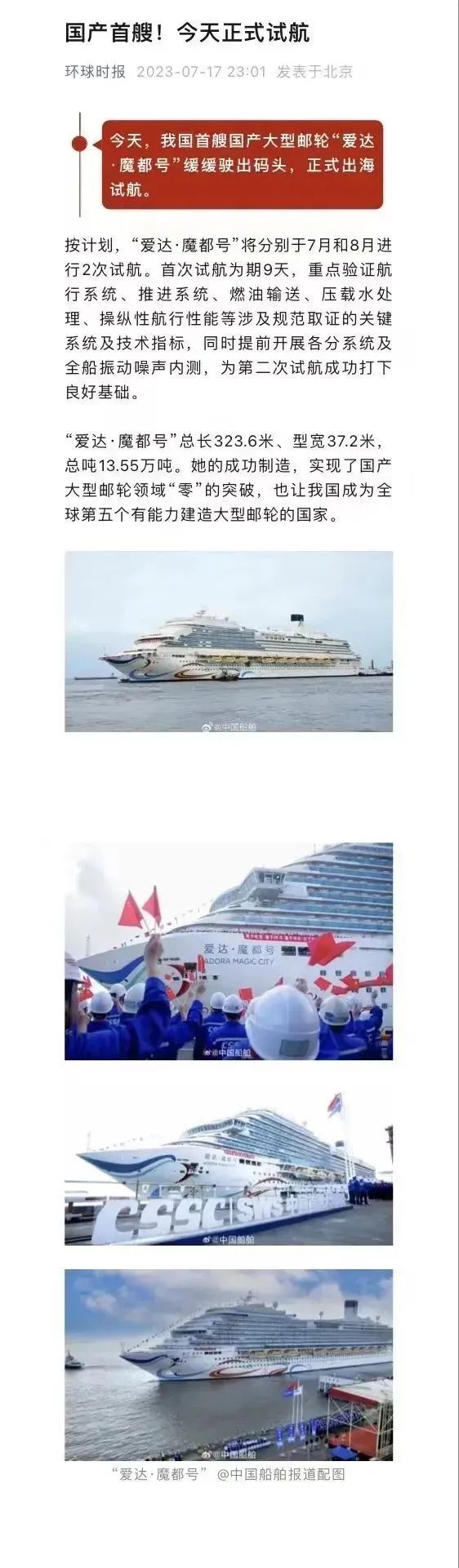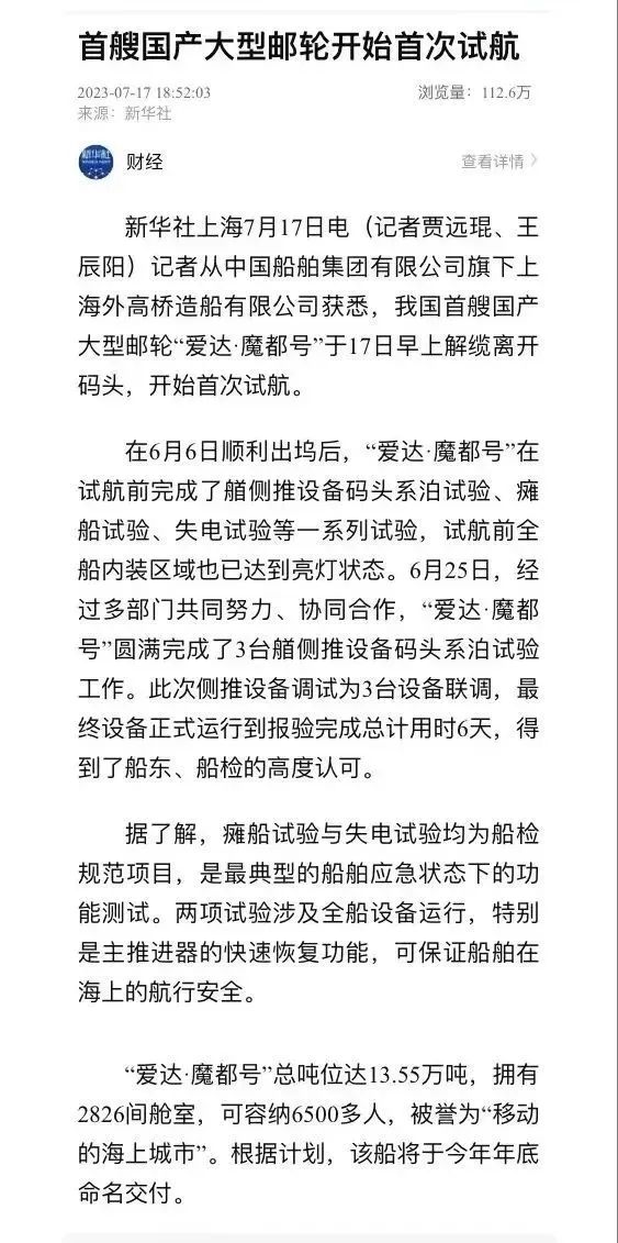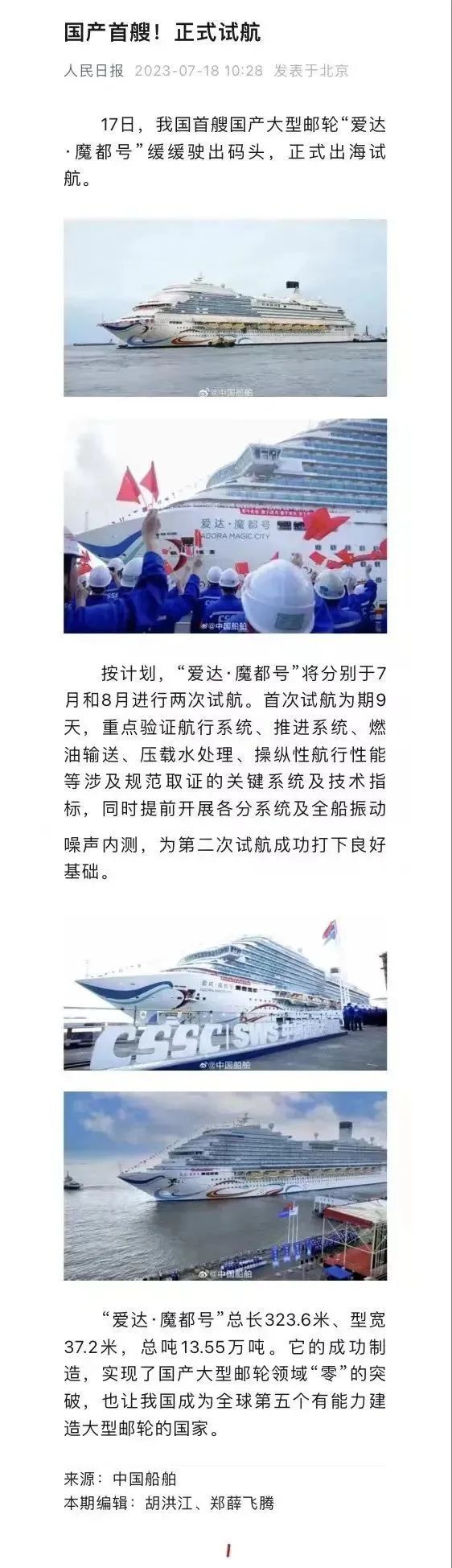 國產(chǎn)首制大型郵輪試航