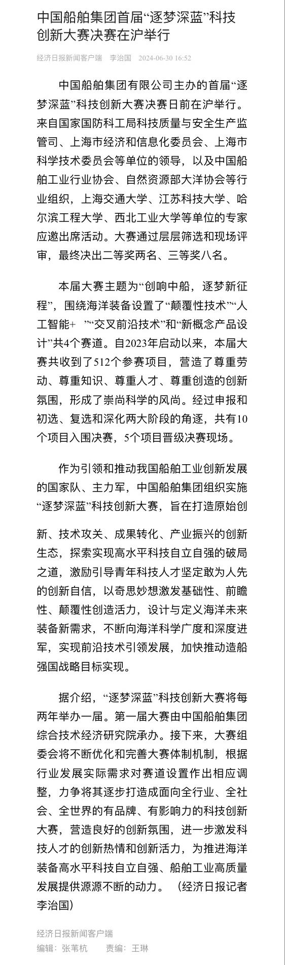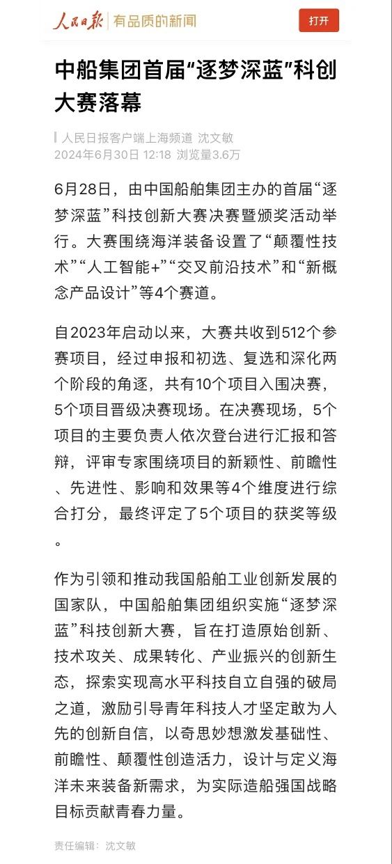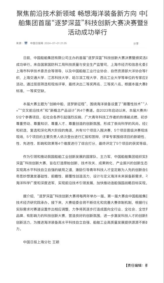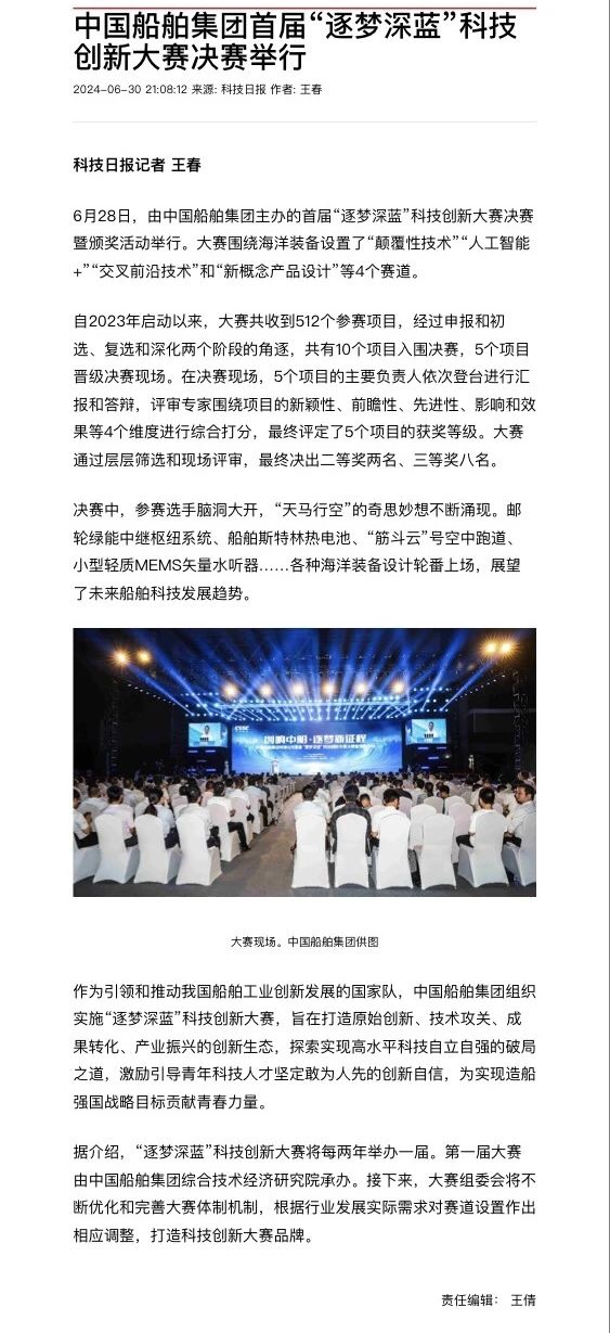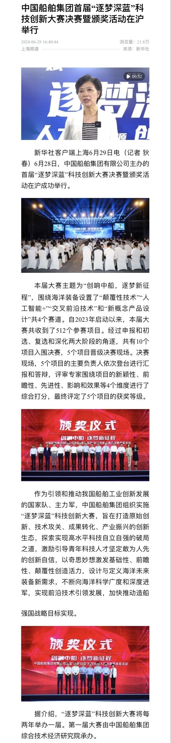 中國(guó)船舶集團(tuán)有限公司主辦的首屆“逐夢(mèng)深藍(lán)”科技創(chuàng)新大賽決賽暨頒獎(jiǎng)活動(dòng)引來(lái)各大媒體的關(guān)注,獲得高度評(píng)價(jià)?!?gt;活動(dòng)回顧