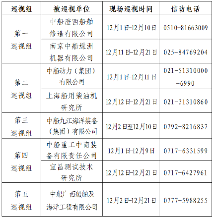 根據(jù)中國船舶集團(tuán)黨組2022年第二輪巡視工作部署,截至2022年12月2日,中國船舶集團(tuán)黨組5個(gè)巡視組已進(jìn)駐中船澄西船舶修造有限公司、中船動(dòng)力(集團(tuán))有限公司、中船九江海洋裝備(集團(tuán))有限公司、中船重工中南裝備有限責(zé)任公司、中船廣西船舶及海洋工程有限公司等單位,開展為期20天左右的巡視“回頭看”。巡視期間,巡視組設(shè)置專門值班電話(具體如下表),同時(shí)在巡視組工作現(xiàn)場(chǎng)設(shè)置聯(lián)系信箱,廣大干部職工可以反映情況。